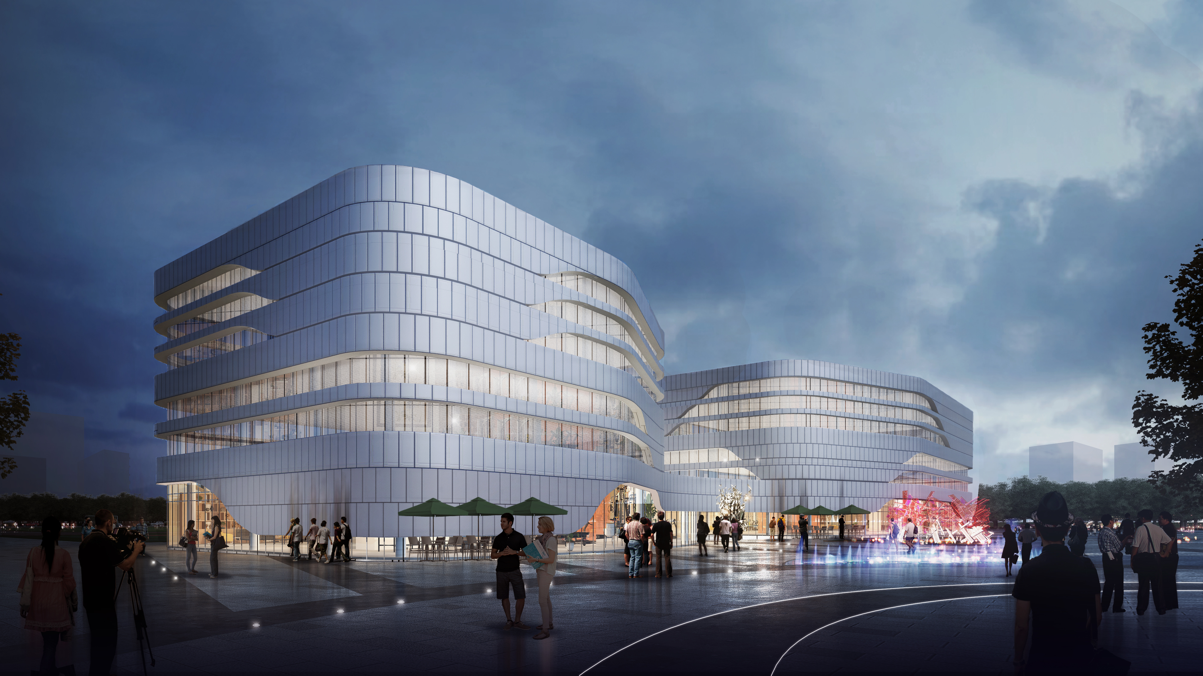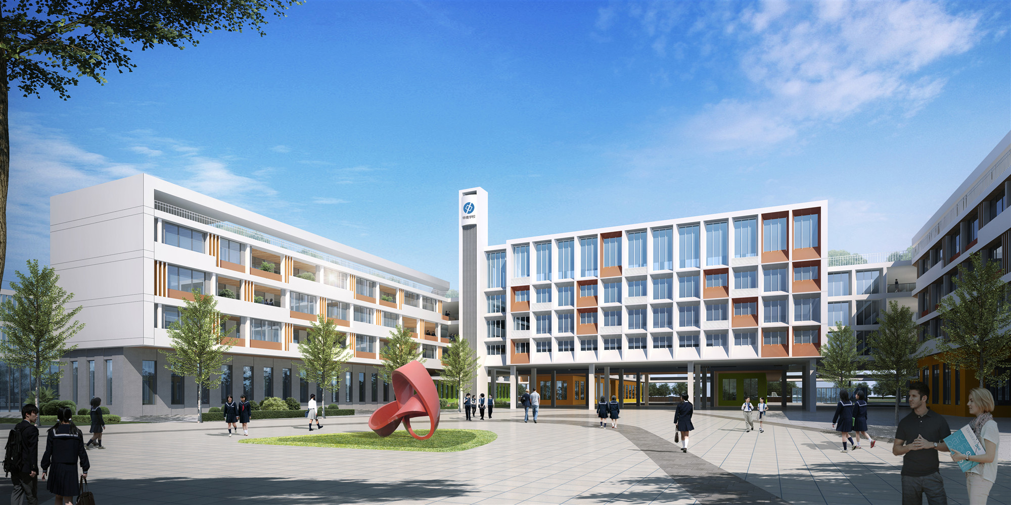 打造具有昭示性、社会性的趣味校园,营造具有记忆性、场所性的校园形态。整个教学楼建筑主体 为开口的形式,中间营造庭院,拥抱自然多彩的立面体设计,为城市提供活力,创造趣味的成长空间。 用色彩搭配富有活力空间,灵动自由。建筑立面处理原则为整体统一性,局部变化,注重整体造型 同时创造趣味性空间,建筑主立面采用白褐色间断配色,活泼灵动。通过颜色变化创造趣味性近人 的空间。