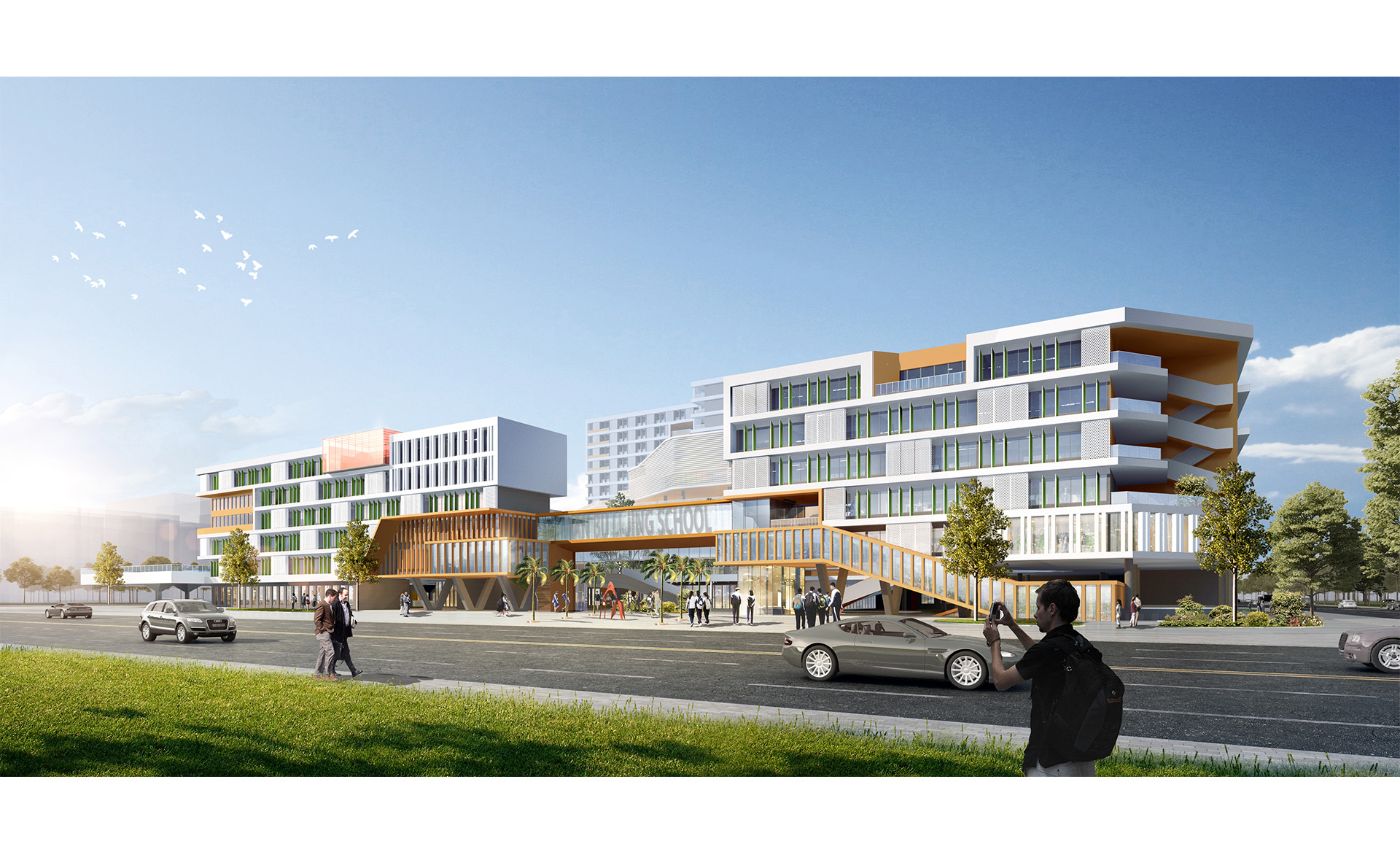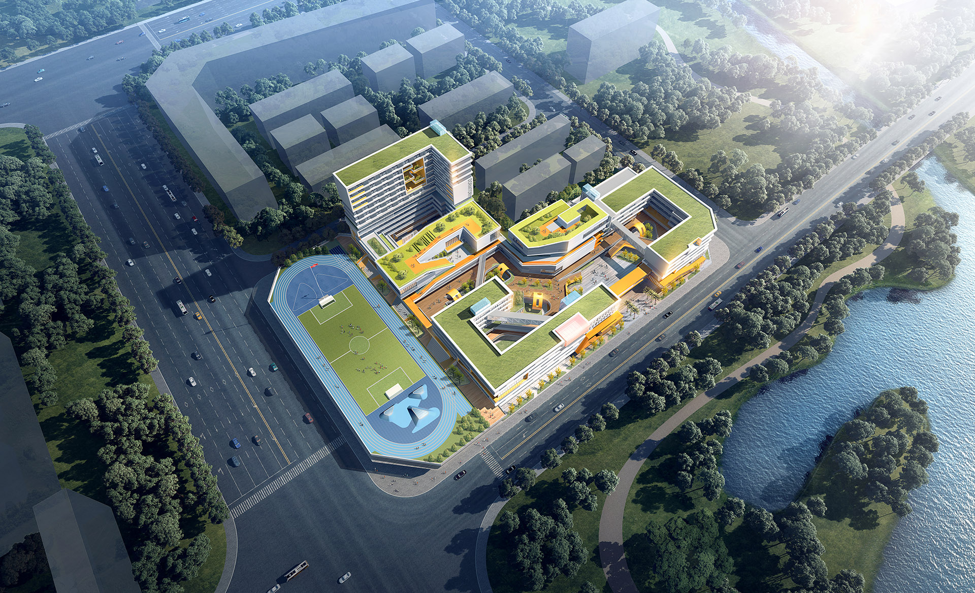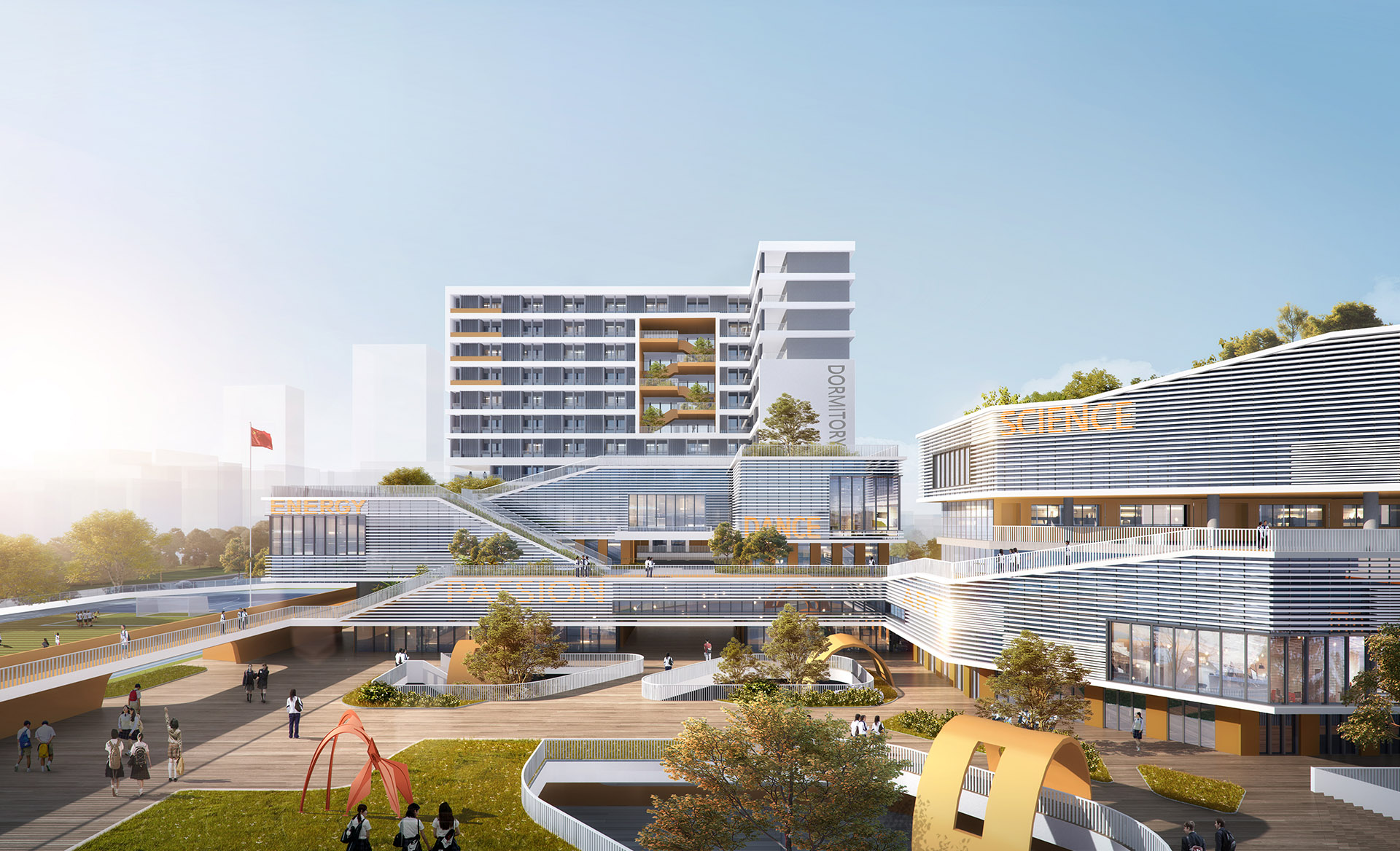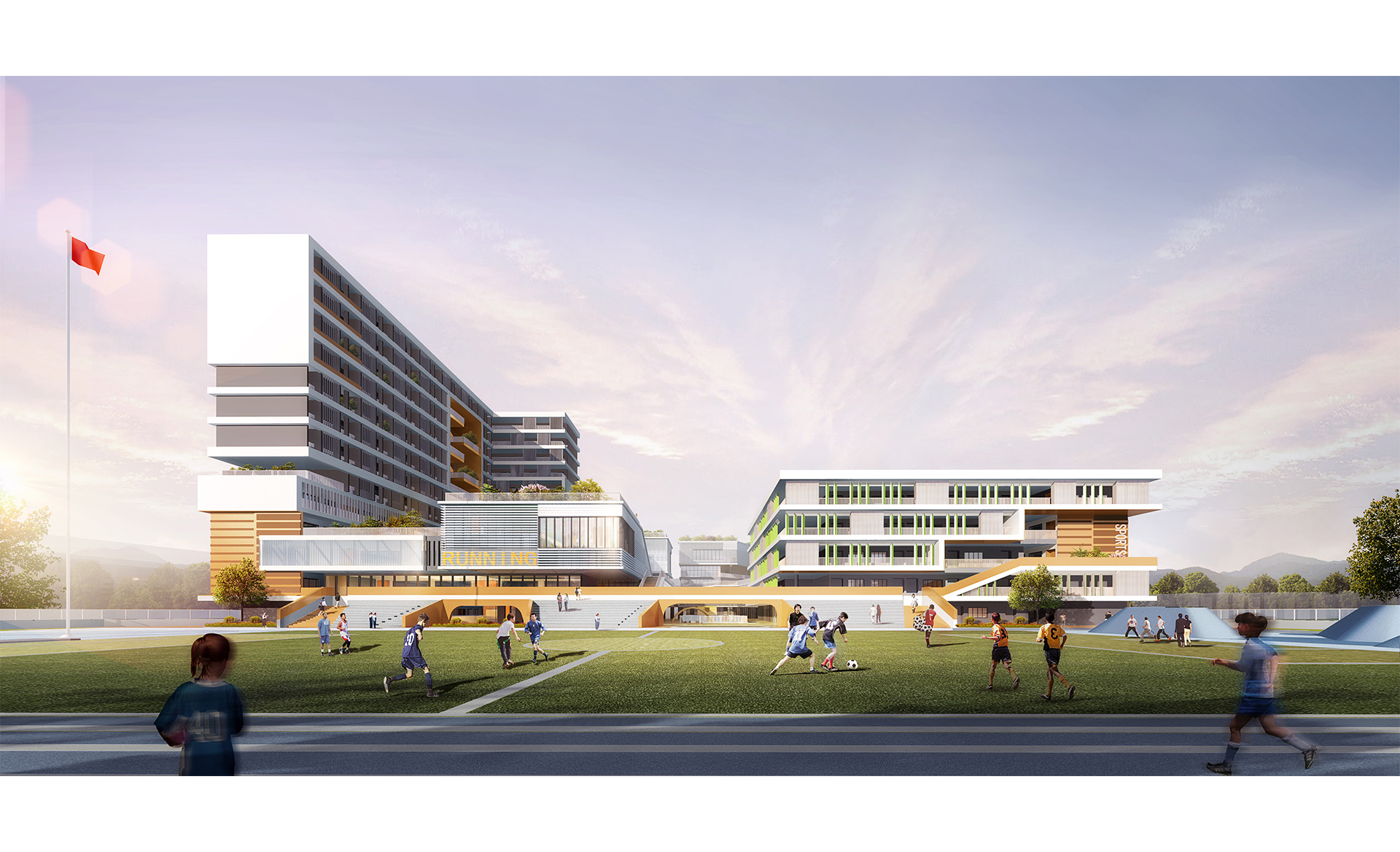 本项目位于广东省深圳市坪山区用地四周环 路,西侧为城市主干道荔景南路,北侧毗邻 立人高级中学及企业配套宿舍,东侧及南侧 相望坪山河湿地公园,视野开阔,景色优美。 在用地西侧抬高运动场,延伸运动场空间, 球场满足坪山区标准,4 片篮球场,2 片排球 场要求;因地制宜,沿基地界面南北向最高 效布置建筑,形成小学、初中、后勤组团; 基地内入口轴线与西侧活力轴串联成校园主 轴;沿校园轴线,形成公共空间及校园客厅, 作为校园社区精神文化中心。