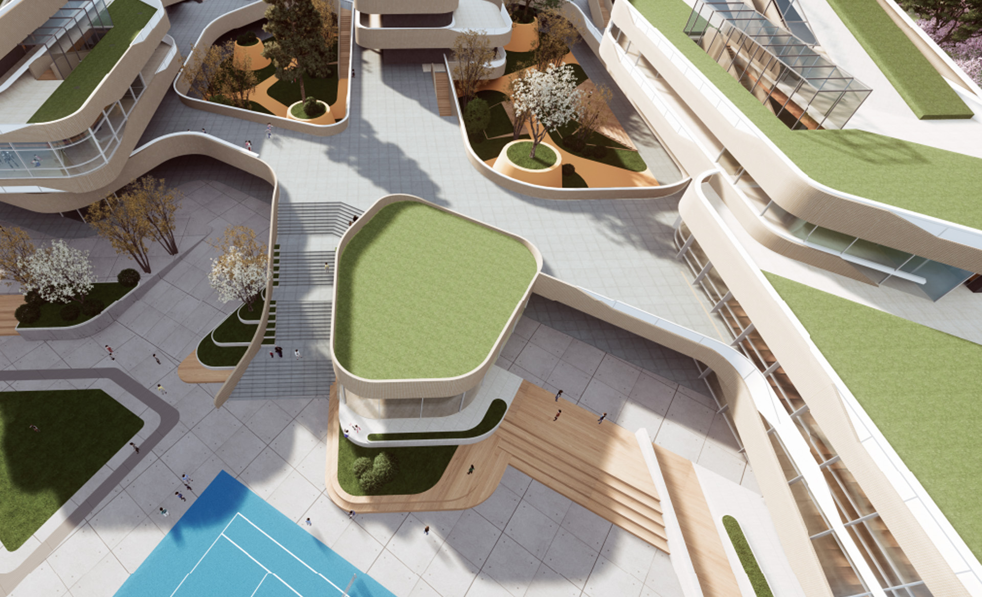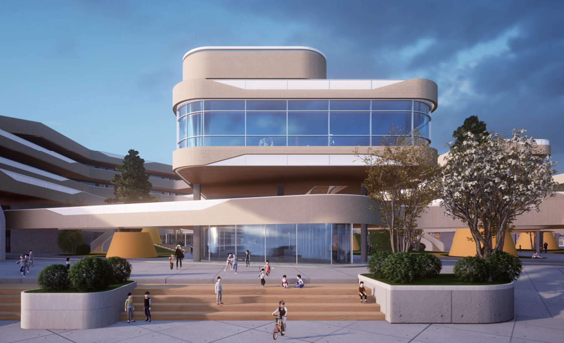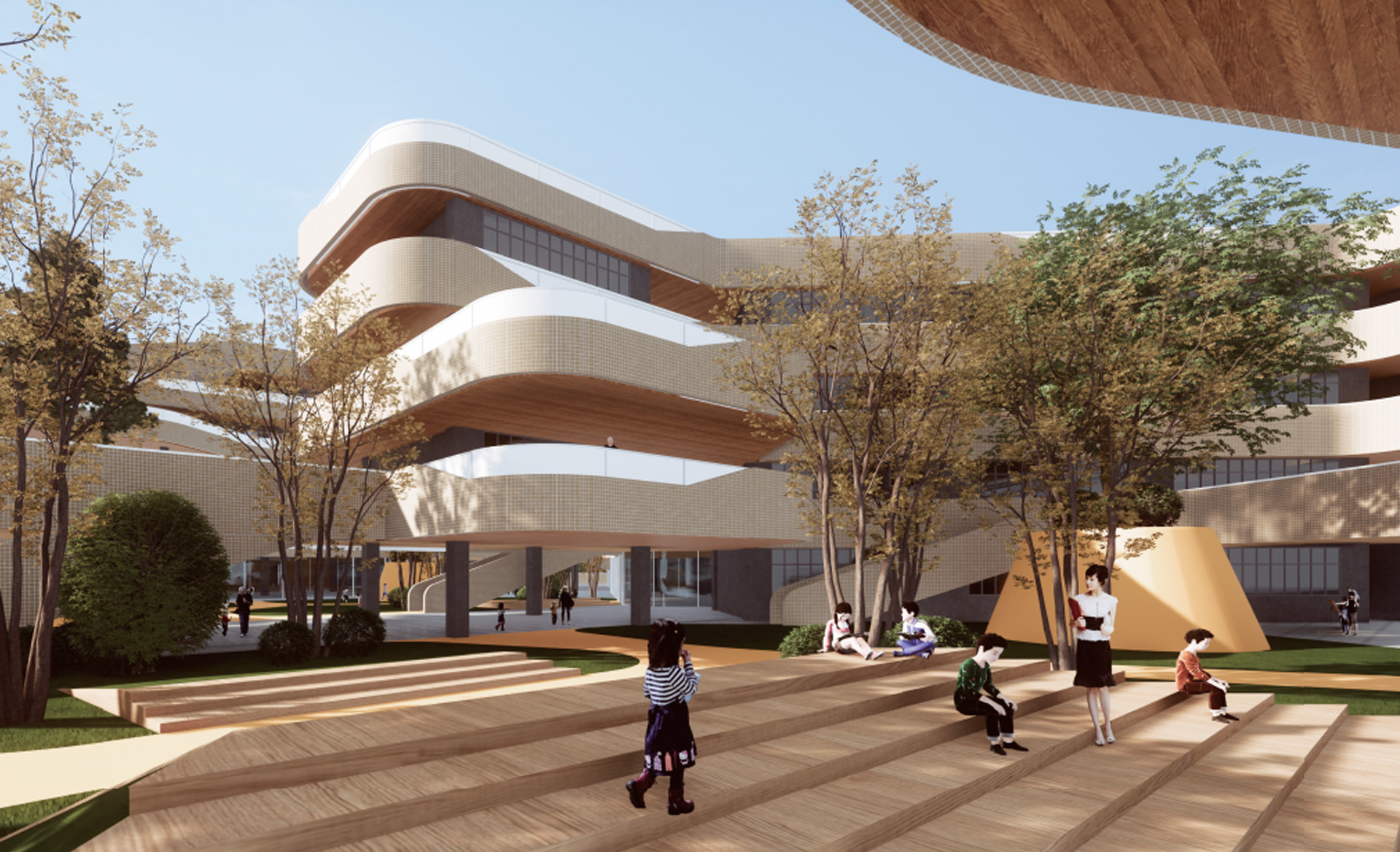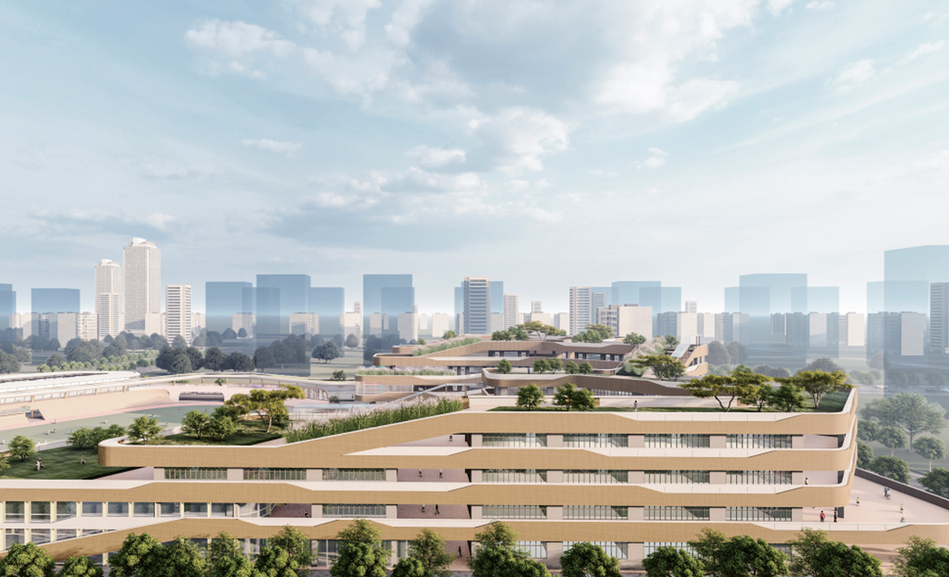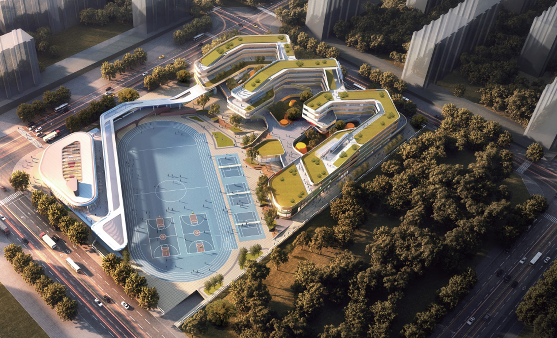融入客家“围屋”理念,北侧教学区围合组团并于南侧运动馆有机连接,整体布局呈现围合形式,西南侧城市界面, 操场呈现开放布局氛围,与对面文体公园相互呼应,合理诠释开放与私密空间;将赣江“流觞曲水”理念融入建筑 形体中,柔化建筑边缘,营造体量灵动轻柔之感。 教学部分和活动部分通过连廊系统和庭院进行分区,同时保持渗透和联系。设计在竖向上层层激活,形成不同高度 的活力,在各个层面为青春的汗水释放提供了空间引擎,将为学生留下一些传统教学空间之外的回忆,在高低台地 上穿梭的每一段兴致勃勃的脚步声。