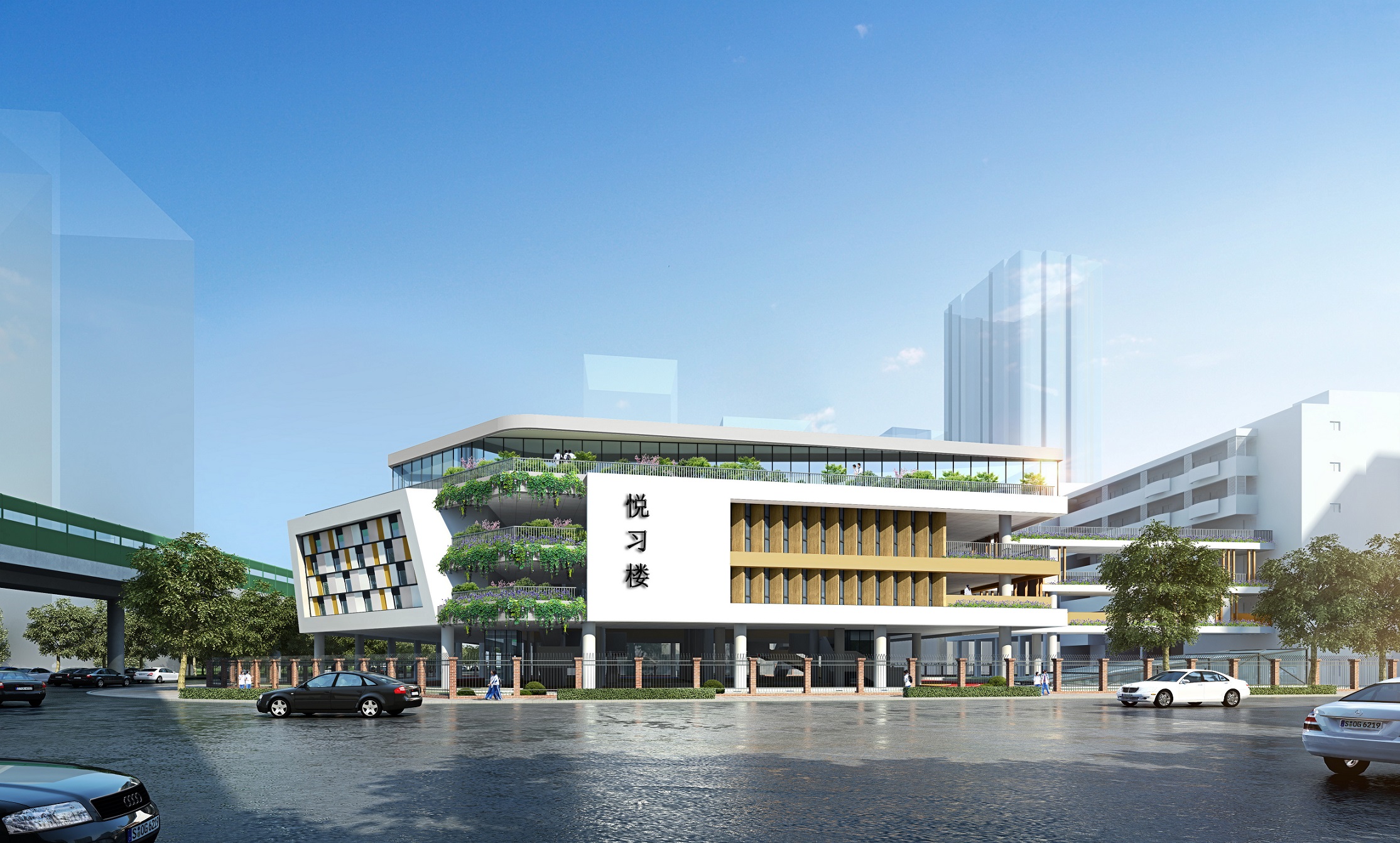 整栋综合楼由东、中、西三部分组成,东侧最为安静,设置功能教室用房,西侧的办公用房及社团活动用房控制在13米以下,避免噪音的干扰,将篮球场、食堂、足球场等大空间集中垂直布置在中间,最大化避免大空间的结构转换,三部分之间通过中庭及连廊过渡,形成分区独立,交通及辅助用房共享化的集成体系。