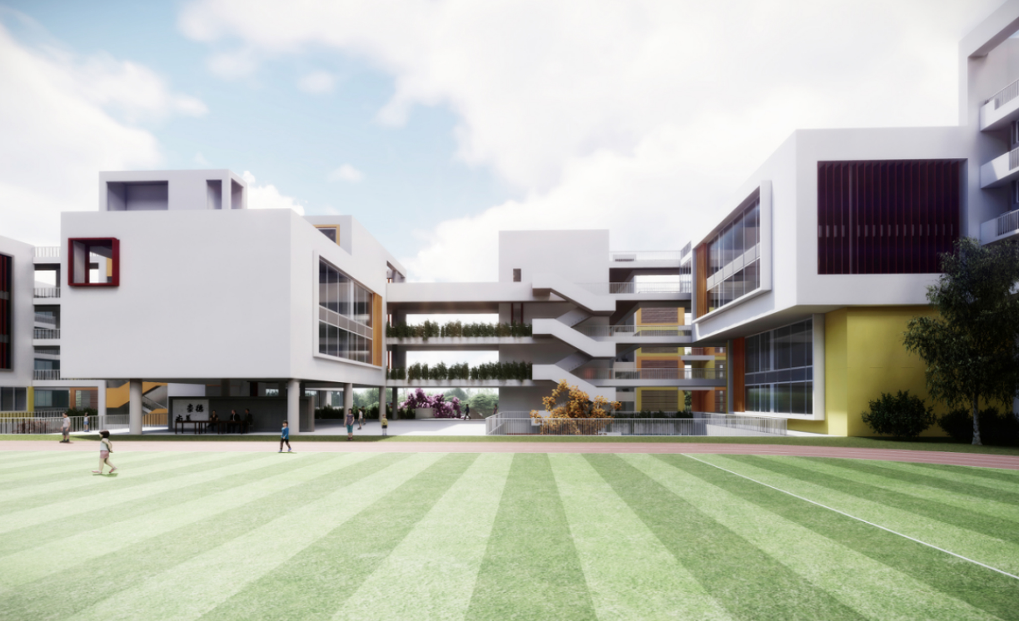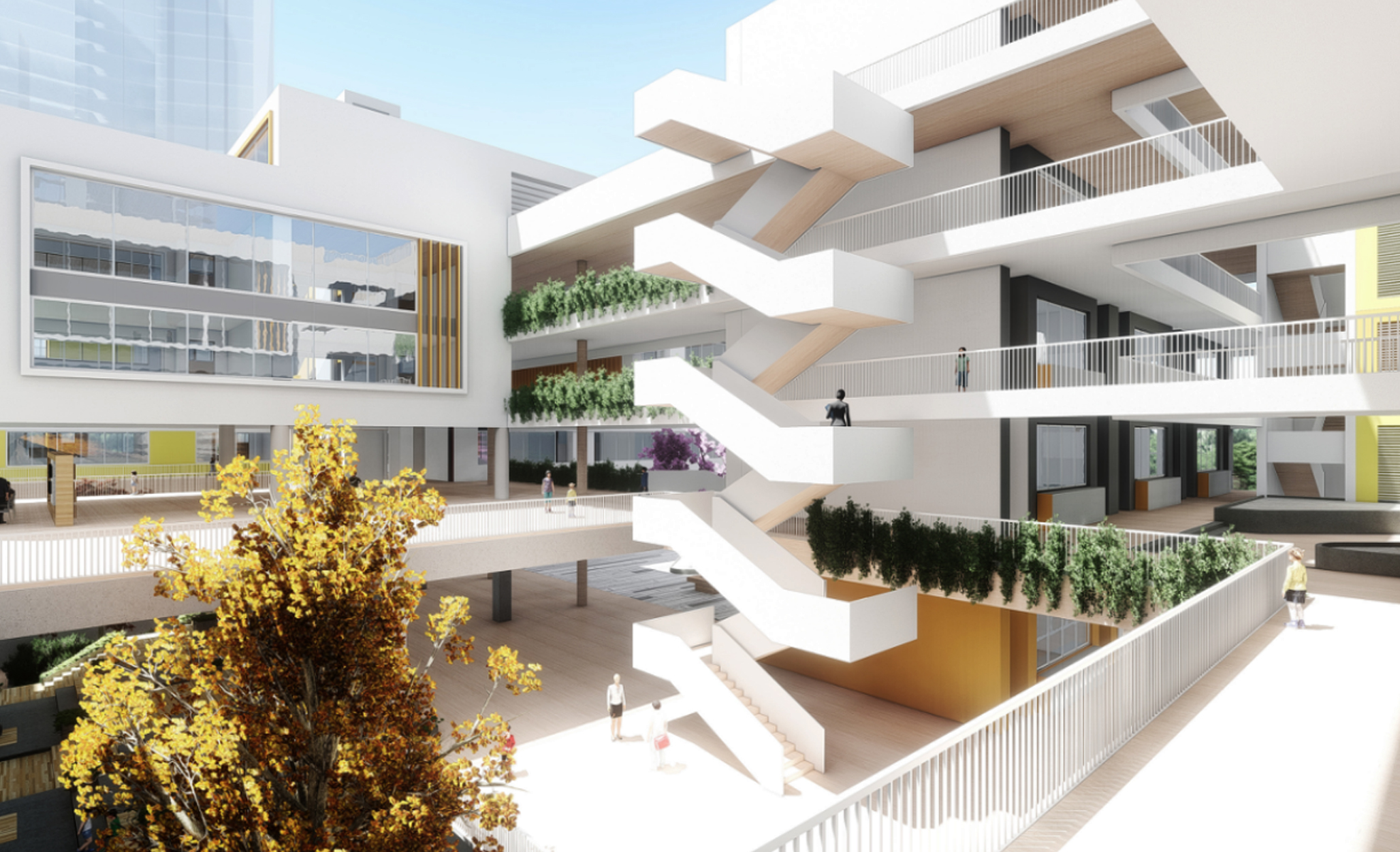 深圳属亚热带气候,常年主导风向为东南风,由 此建筑主要采用南北向的布局方式,并通过设计 开敞式的东向风雨走廊,使常年主导风可以通过 走廊及架空入口进入整个建筑群,形成良好的通 风效果。通过底层架空,形成通风廊道,有利于 空气对流,南侧走廊起到遮阳效果。中庭热空气 形成对流,产生自然风,形成整体布局的通风环 境,节约能耗。