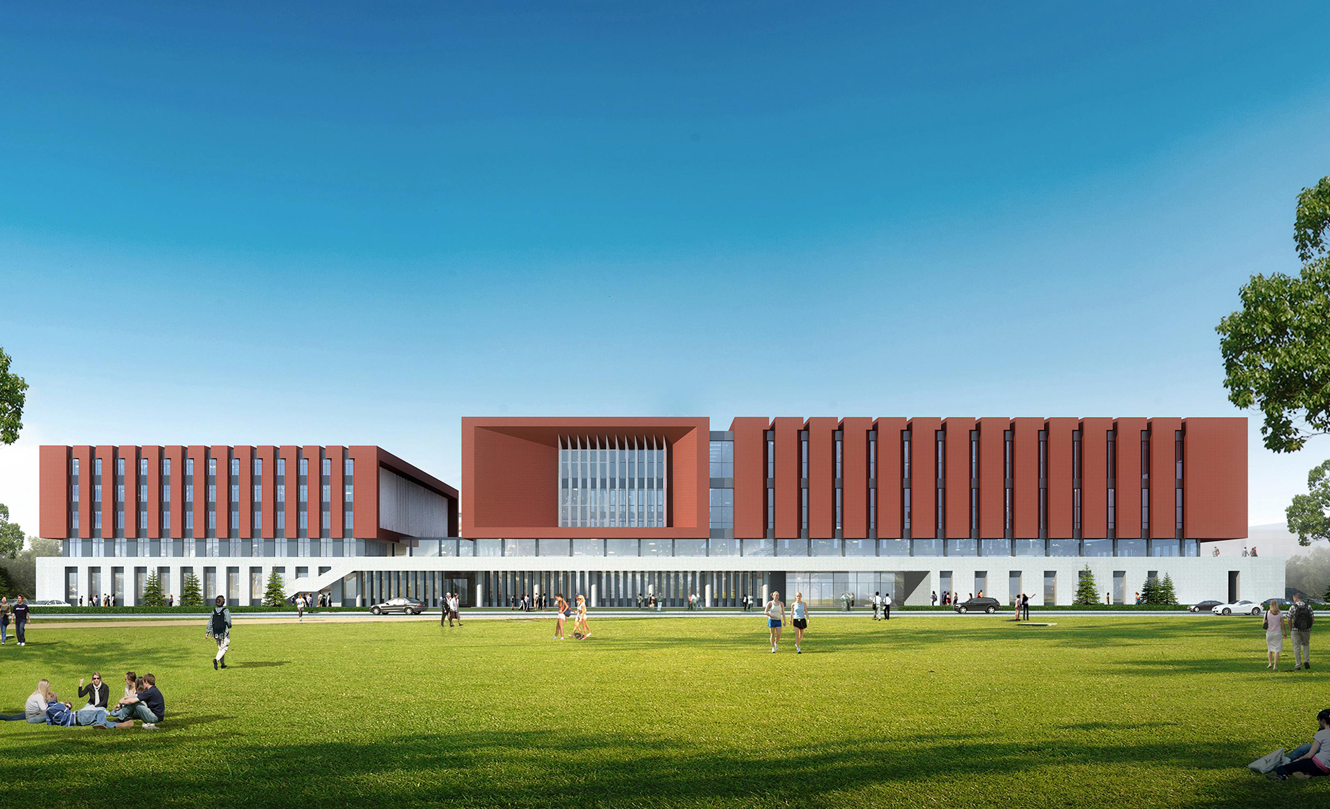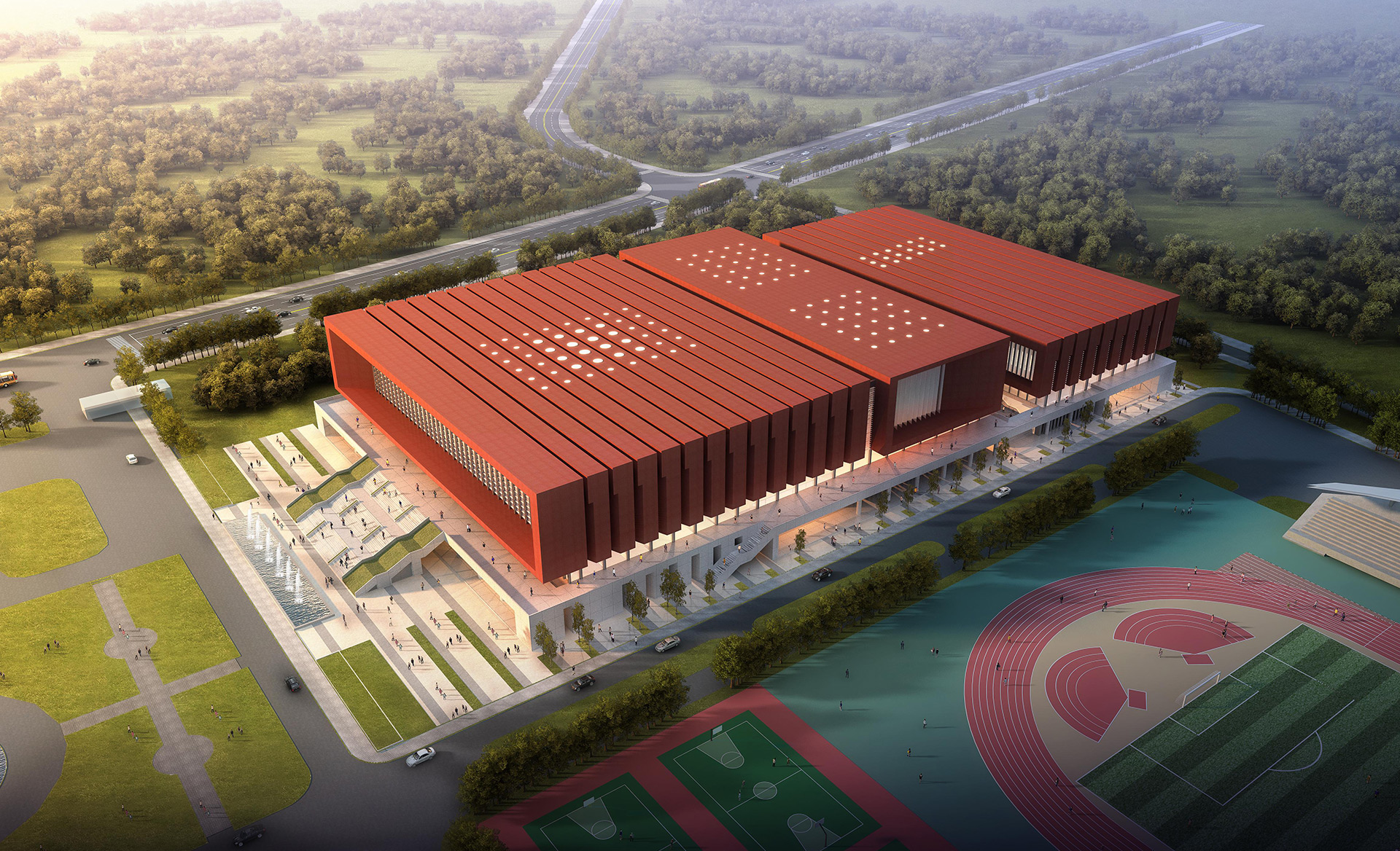面向校园主广场设置比赛馆主入口,与图书馆隔 空远眺。前侧设置景观大台阶,营造入口的仪式 感和舒适性。体育馆与现有体育场一体化考虑, 形式上有所呼应,二层平台亦可成为田径场体育 比赛的临时看台。 项目场地用地紧张,环境局促,采用一体化集约 布局模式,最大化释放室外空间,提升校园环境 品质。建筑底部采用连续的大平台,上部体量进 行分解和活化,最大化消解巨大建筑体量给周边 环境带来的压迫感。三个体量对应“主馆”“副 馆”“教学办公”三个部分,各部分拥有独立的 入口,增强各部分的“识别性”和“引导性”。