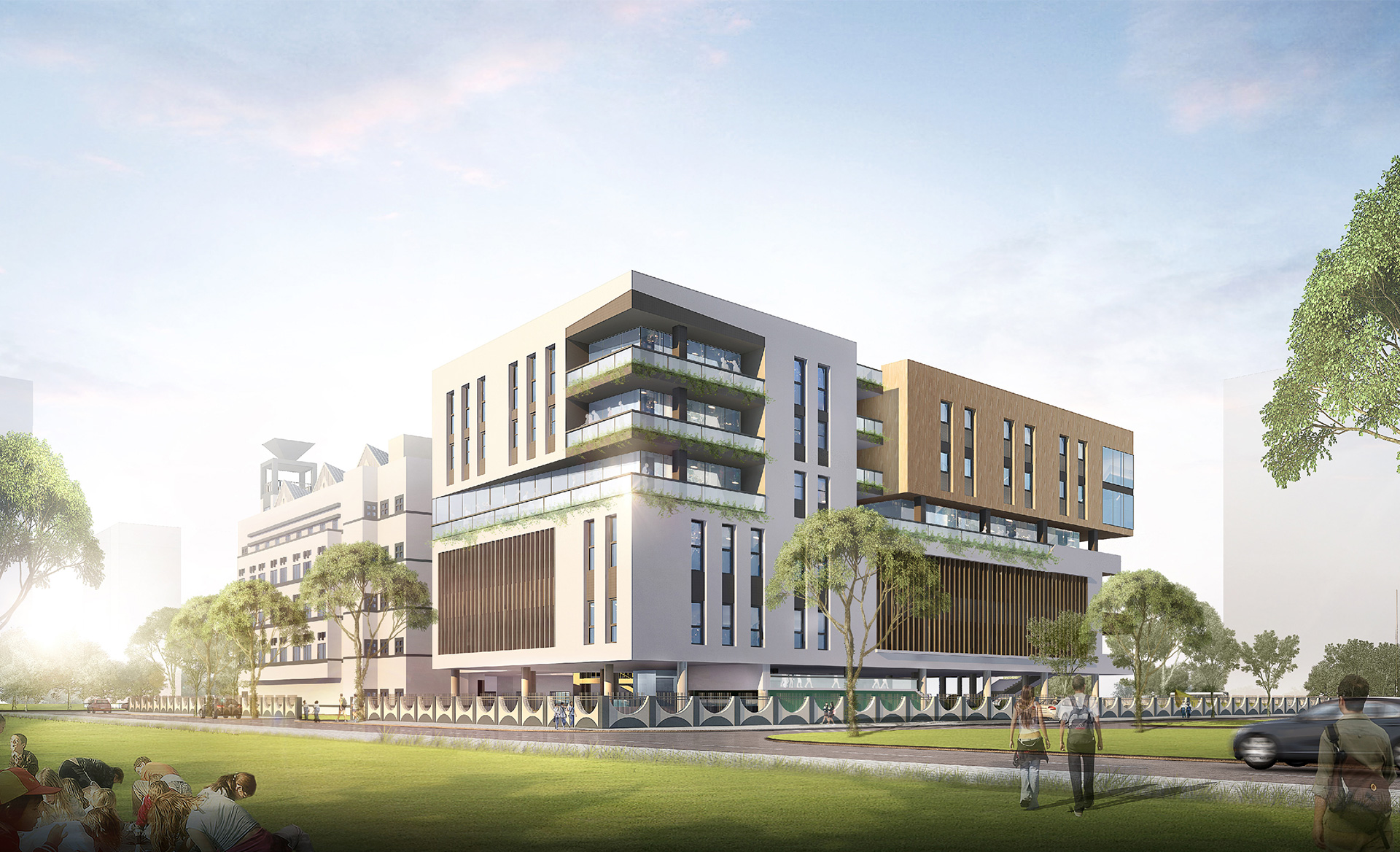 本项目位于深圳市盐田区外国语小学校区内,与海天一色住宅小区相邻.该校现有26个大班,7个小班,在校学生1023人。 建筑整体为两层裙楼和五层塔楼组成,底层架空,中间二层裙楼部分为室内篮球场,其他教学办公及辅助用房沿边呈"L"型布置,让篮球场尽可能靠近操场布置,强化了各功能之间的联 系,也避免了结构转换,同时采用外廊的形式将其他功能空间,沿室内篮球场的屋顶花园半围合布置,同时创造出更多的室外活动空间。